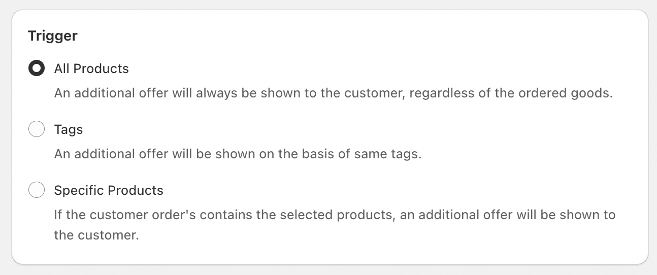 Your post-purchase campaign should appear by selecting a trigger type. This setting controls which products will show your campaign on the post-purchase page.