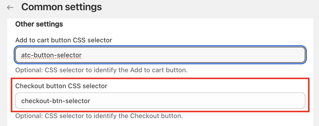 Scroll to the Other Settings section and paste the copied class name into the Checkout button selector field.